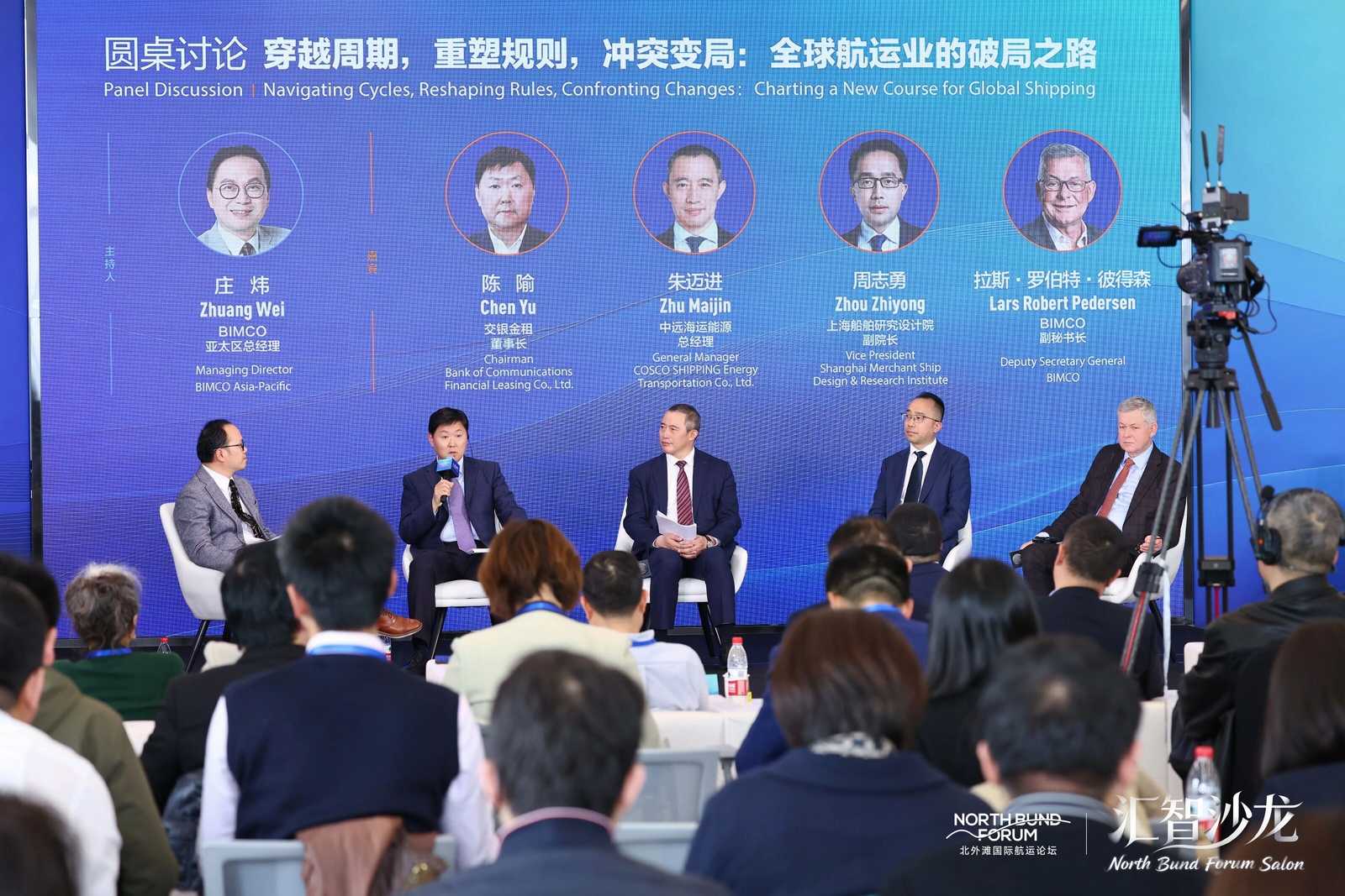 现场沙龙技艺,BIMCO亚太区总司理庄炜对话交银金融租借有限公司董事长陈隃、中远海通晓力运载股份有限公司总司理朱迈进、上海船舶商议打算院副院长周志勇、BIMCO副文牍长拉斯•罗伯特•彼得森。五位嘉宾围绕“穿越周期,重塑端正,冲突变局:公共航运业的破局之路”这一话题,赶快缘政事风险、金融撑执与绿色转型伸开深度对话。